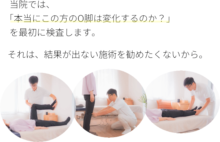 骨格の形状などを丁寧に検査し、”そもそも矯正で改善できるO脚かどうか”を見極めてからお受けしています。